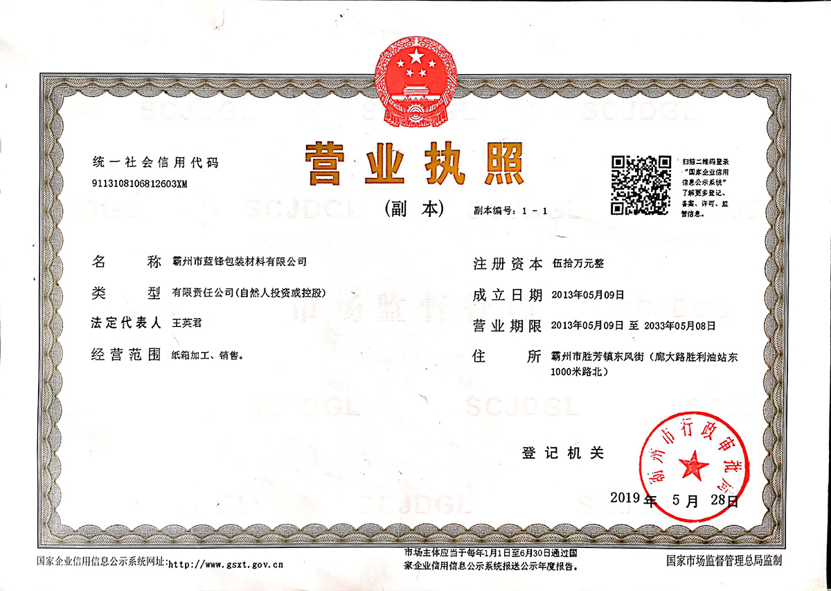 立即咨詢霸州市藍(lán)鋒包裝材料有限公司,前身為成立于1988年的勝芳鎮(zhèn)藍(lán)劍紙箱廠。是河北省較早涉足紙包裝制品的民營(yíng)企業(yè)。經(jīng)過近三十年的發(fā)展,公司已經(jīng)由起初的家庭作坊發(fā)展為現(xiàn)有標(biāo)準(zhǔn)化廠房8000平米,員工50人,其中管理人員7名;年產(chǎn)紙箱上億平米的現(xiàn)代化企業(yè)。